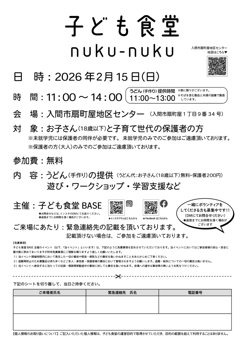 子ども食堂nuku-nuku 次回2/15(日)入間市扇町屋地区センターにて開催